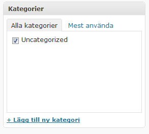 Inläggen du skriver går att kommentera av besökare, om du inte väljer att stänga av det, vilket gör att det är inlägg snarare än sidor du använder när du ska blogga. Alla dina inlägg läggs i kategorier, och det kan vara bra att skapa en eller ett par kategorier innan du sätter igång. Du kan också lägga till kategorier längre fram när du vill. Väljer du ingen kategori läggs ditt inlägg i kategorin Uncategorized. Välj i vilken/vilka kategorier ditt inlägg ska hamna i rutan längst ner till höger. Allting går att ändra i efterhand om man vill.