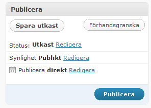 När du skriver ditt inlägg/sida, kan du publicera genom att klicka på knappen längst till höger. Du kan också förhandsgranska och spara utkast, vilket betyder att den du gjort sparas så att du kan fortsätta senare, men inget publiceras eller dyker upp på sidan.